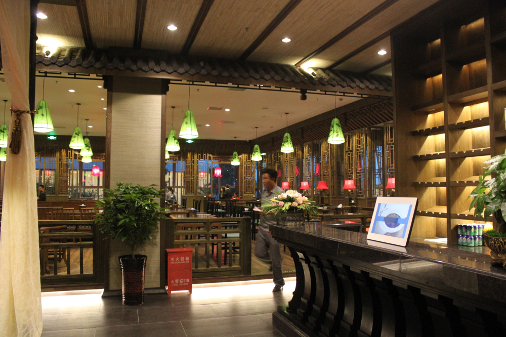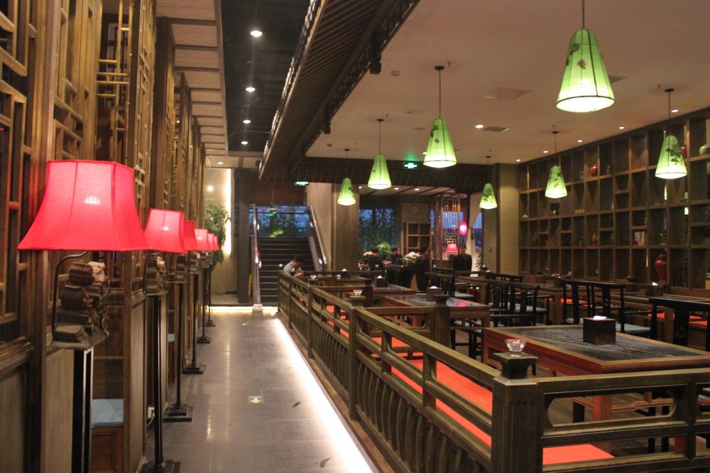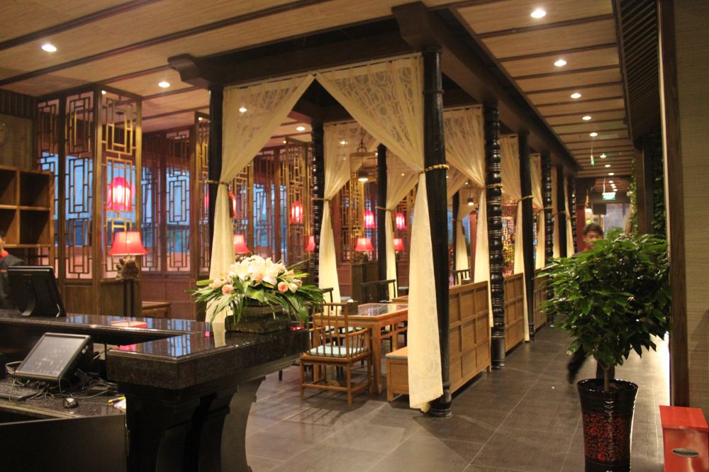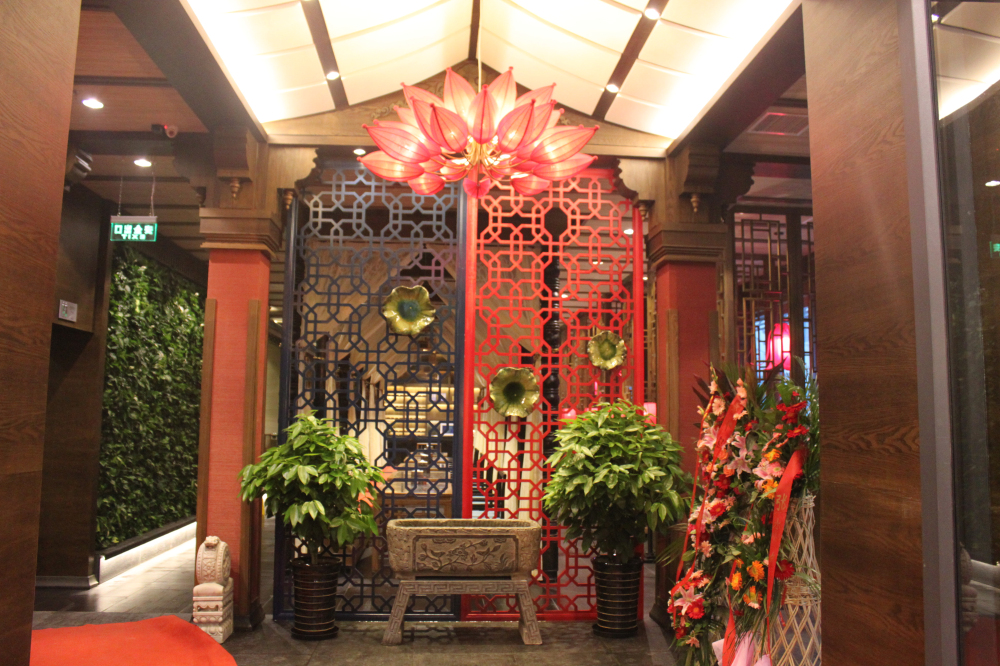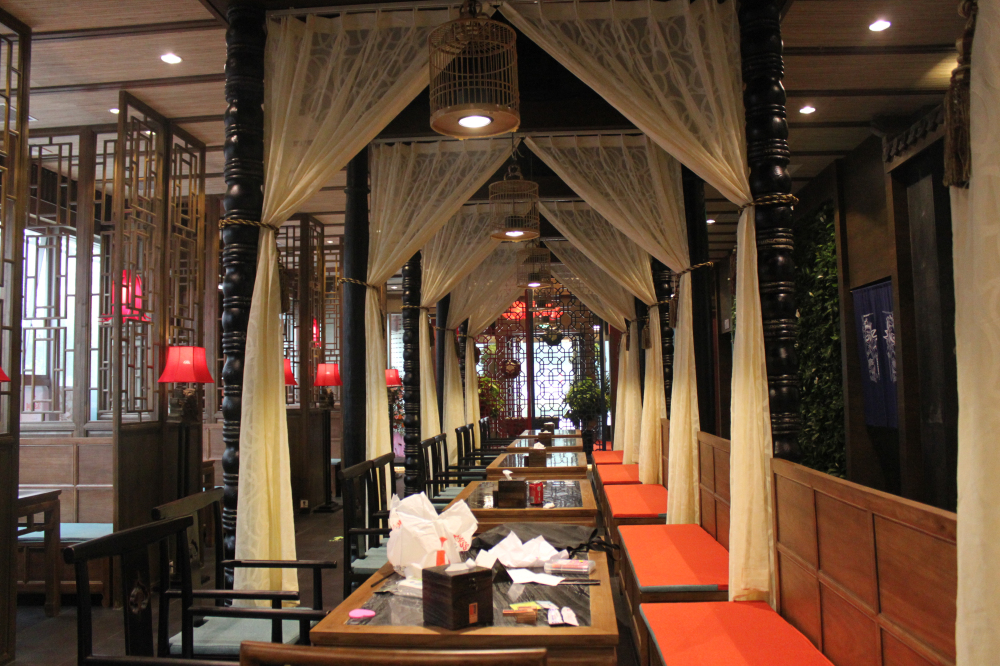 具有中國特色美食傳承的古典美食文化,以中式挑檐的復古結構應用在外面和門頭上,強烈的傳承和特色撲面而來。古人對文化講究均在門面上,牌匾,石獅,燈籠,脊獸等等...... 灰色的地磚和石獅的陳設融合,詮釋這些傳承的故事,紅色的桌椅和燈籠營造熱鬧和諧的氛圍。紅黃相間的暖色調,整體減弱灰色地面所帶來的涼意。相輔相成的搭配,讓空間變得更加豐滿。