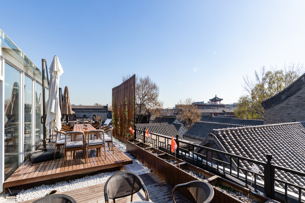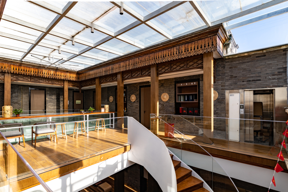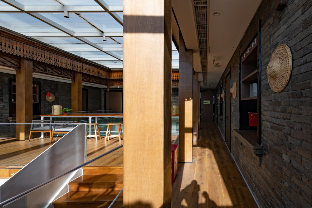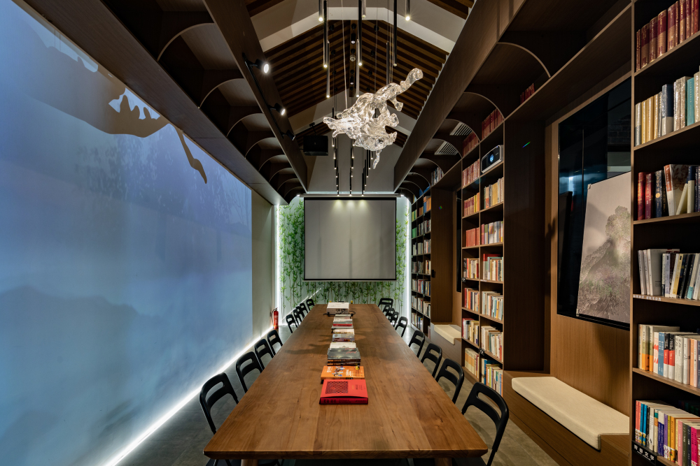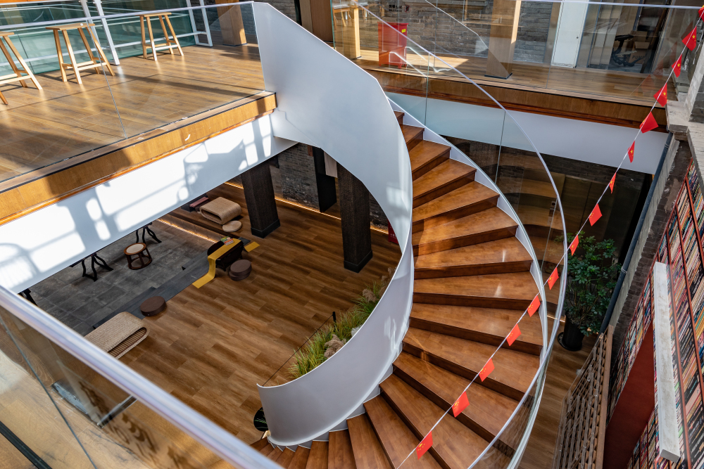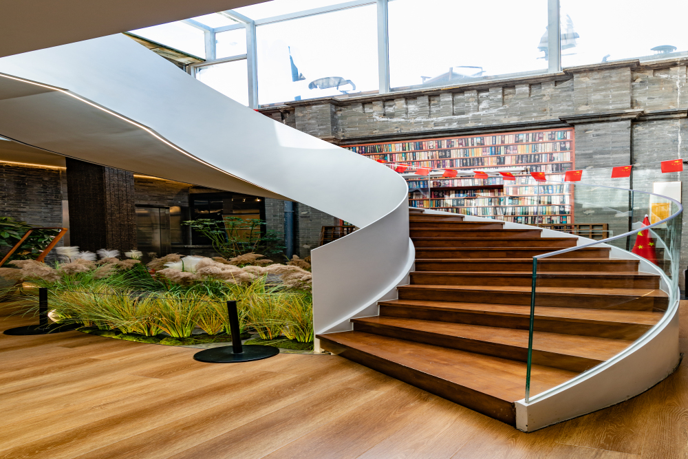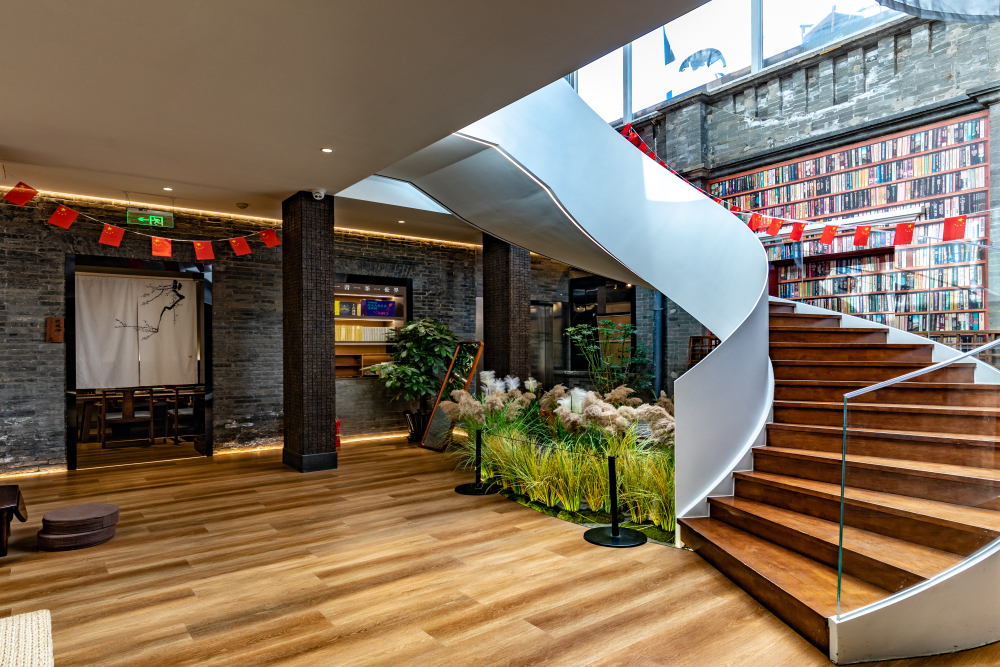門內的綠色盆栽,回旋樓梯處草木叢生,門外的翠竹映襯陽光,在此環(huán)境內飲茶,淡雅悠閑中透著絲絲獨屬于茶的禪意。