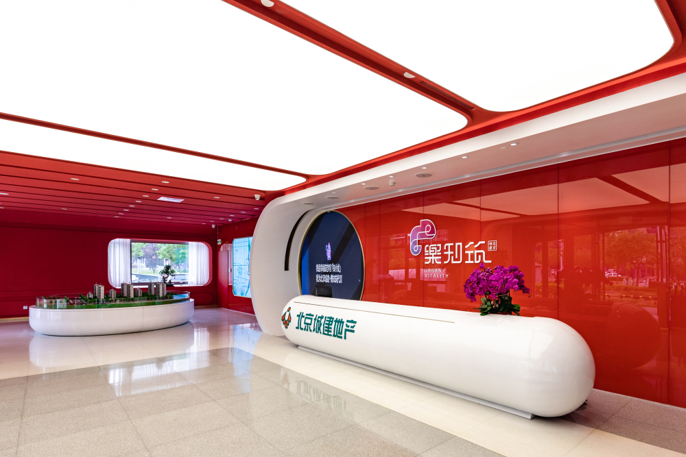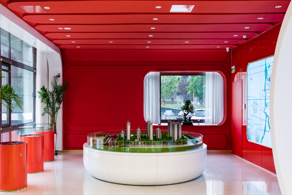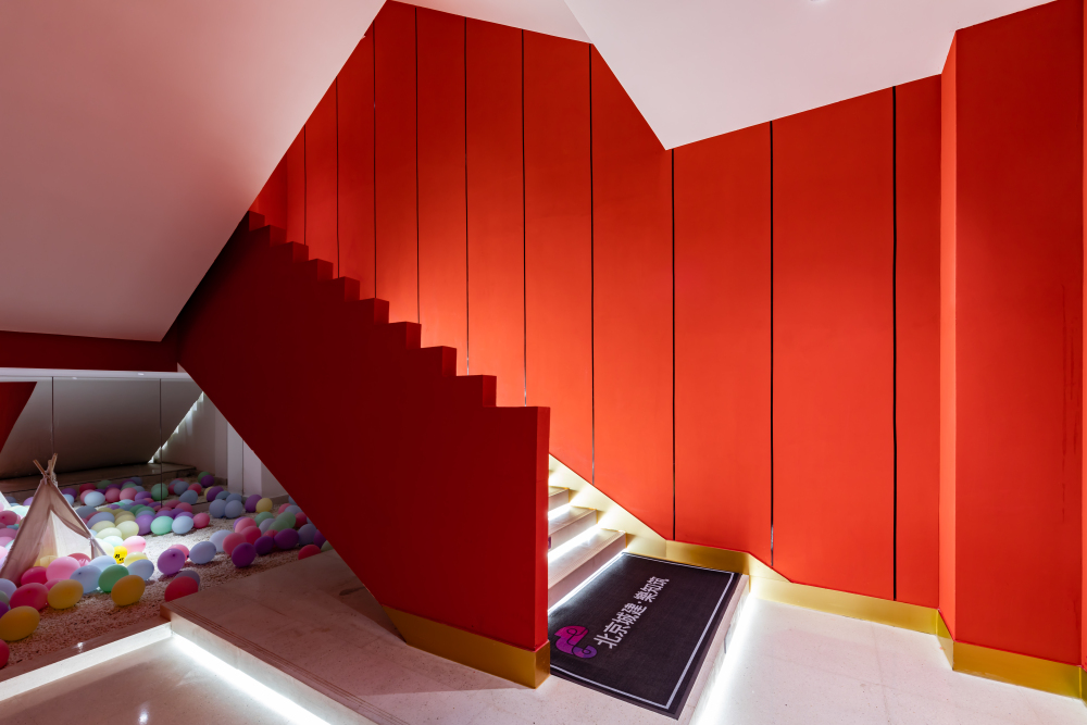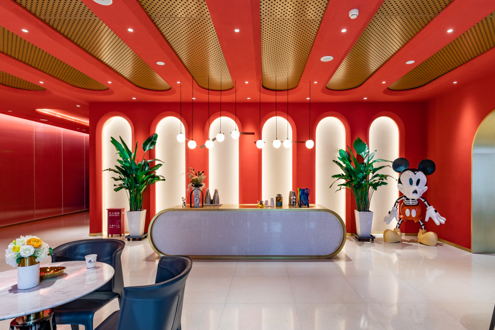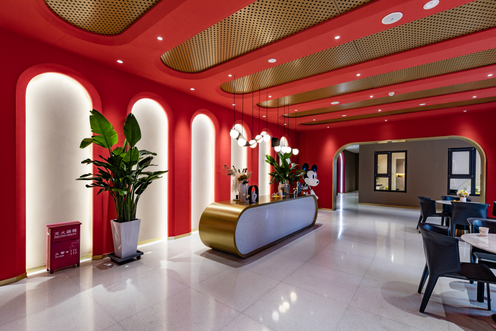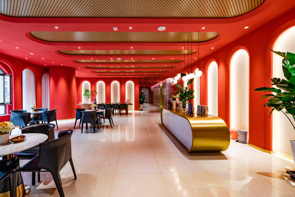 大膽的紅白金配色,呈現(xiàn)出更精致的撞色感,明亮的燈光下,墻壁線條感流暢,光影明媚,整個(gè)大廳在一派大方中盡顯富麗堂皇。